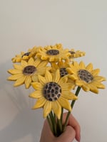 Handmade sunflower made from white earthenware clay, bisque fired, hand glazed and refired. Approximately 4cms diameter on a 28cms wired stem.