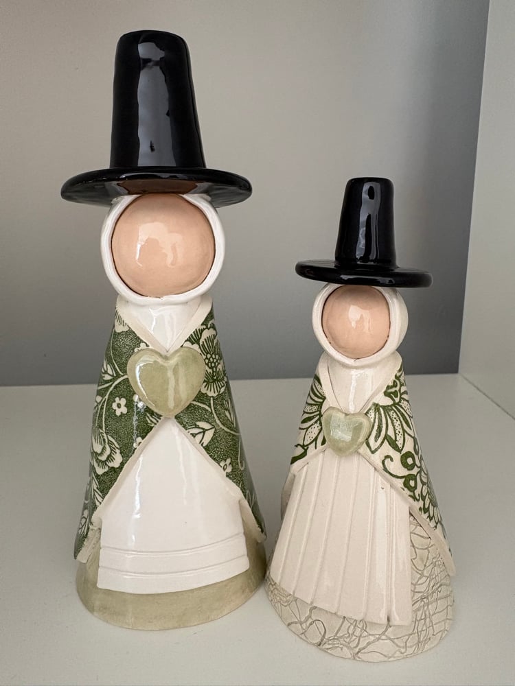 Medium Welsh lady handmade from white earthenware clay, fired in the kiln, hand glazed and re fired. Approximately 16-18 cms tall.