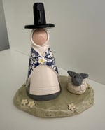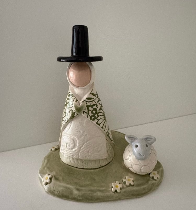 Handmade small Welsh lady with sheep in meadow. Hand built from white earthenware clay, bisque fired, hand glazed and refired. Approximately 14 x 12cms.